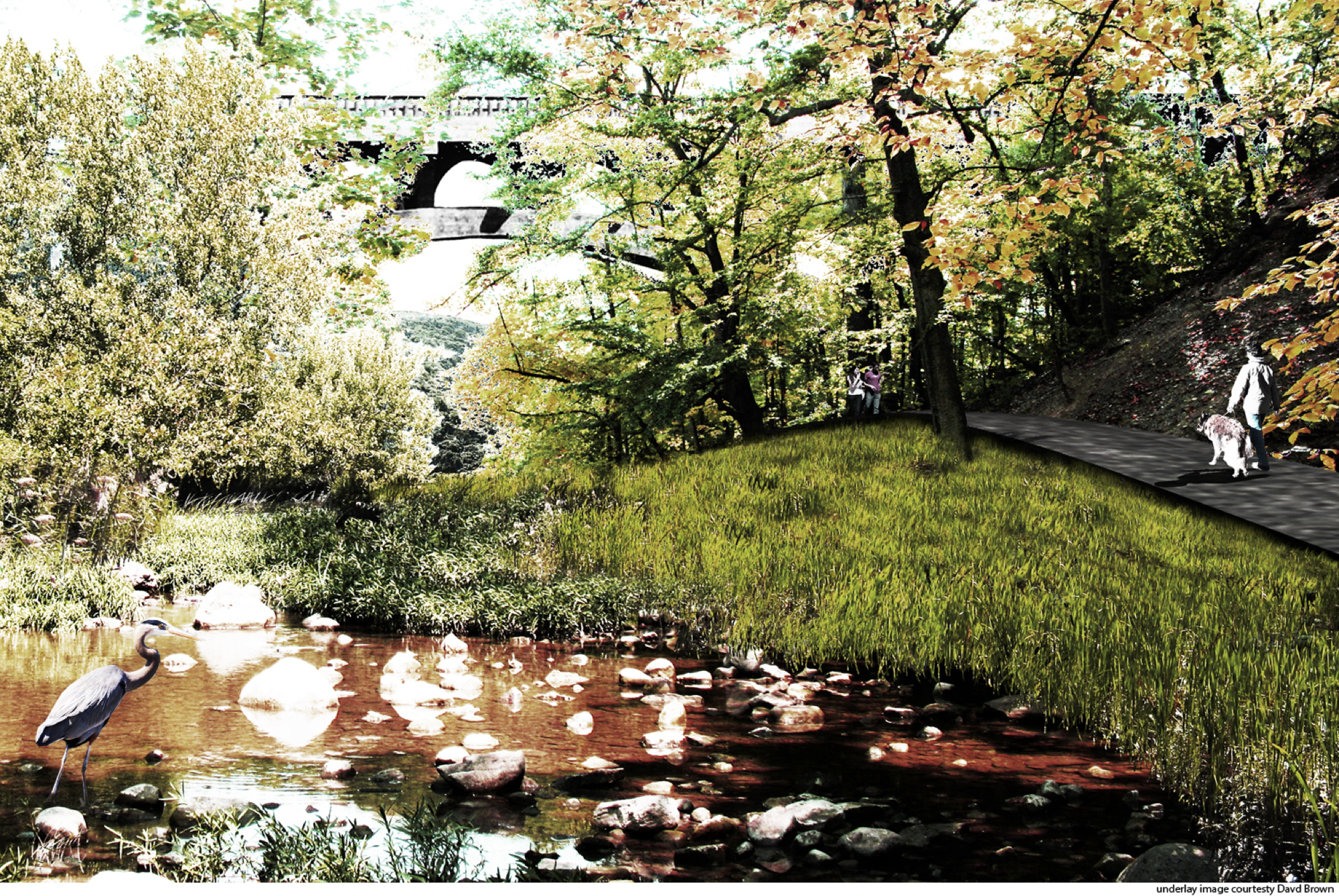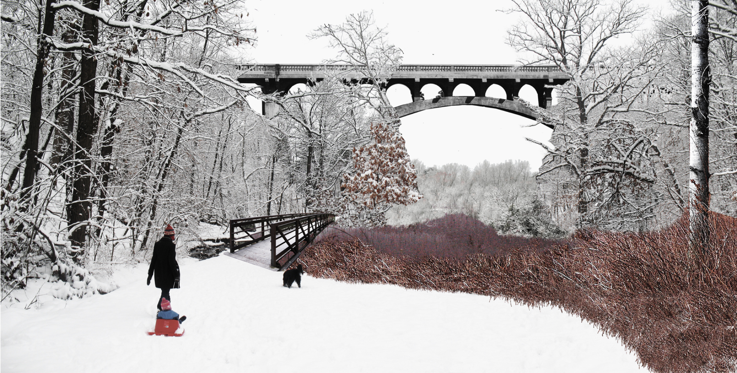 Proposal: Glen Echo Ravine Daylighted at High Street – Looking east, winter (click for more detail):